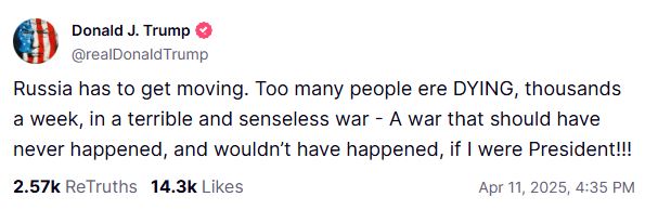 «Η Ρωσία πρέπει να κινητοποιηθεί. Πάρα πολλοί άνθρωποι πεθαίνουν, χιλιάδες την εβδομάδα, σε έναν τρομερό και παράλογο πόλεμο – Έναν πόλεμο που δεν έπρεπε ποτέ να έχει συμβεί, και δεν θα είχε συμβεί, αν ήμουν Πρόεδρος!», έγραψε χαρακτηριστικά.