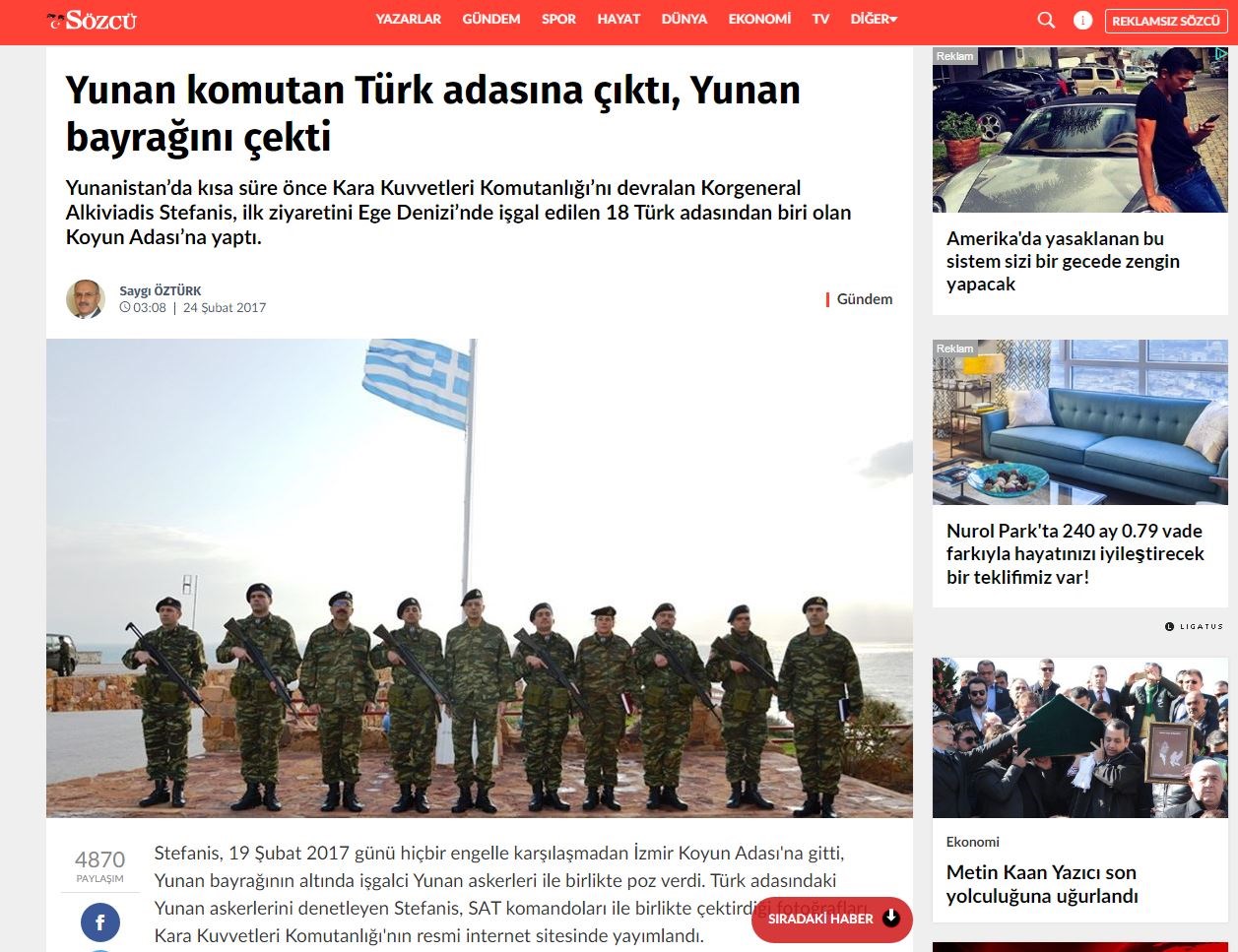 Οι τουρκικές προκλήσεις συνεχίζονται με την εφημερίδα Sozcu που υποστηρίζει την αντιπολίτευση στη γείτονα χώρα, να αναφέρει ότι ο νέος Αρχηγός του ΓΕΣ, Αλκιβιάδης Στεφανής, λίγες μόλις ημέρες από την ανάληψη των καθηκόντων του, πήγε σε ένα από τα 18 τουρκικά νησιά που παράνομα κατέλαβε η Ελλάδα και ύψωσε ελληνική σημαία.«Ο Έλληνας αρχηγός ΓΕΣ Αλκιβιάδης Στεφανής, πραγματοποίησε την πρώτη επίσκεψή του από την ανάληψη των καθηκόντων του, στο νησί Koyun ( Παναγιά), σε ένα από τα 18 τουρκικά νησιά τα οποία έχει καταλάβει παράνομα η Ελλάδα», αναφέρεται στον πρόλογο του δημοσιεύματος. «Ο Στεφανής χωρίς να αντιμετωπίσει κανένα εμπόδιο επισκέφθηκε το νησί Κoyun της Σμύρνης, και πόζαρε κάτω από την ελληνική σημαία μαζί με τους καταληψίες Έλληνες στρατιώτες. Η φωτογραφία δημοσιεύτηκε στην επίσημη σελίδα των Ενόπλων Δυνάμεων», συμπληρώνεται στο ρεπορτάζ.Στη συνέχεια, στο κείμενο γίνεται αναφορά στη Συνθήκη της Λωζάννης και στους… Βαλκανικούς Πολέμους λέγοντας πως η Συνθήκη δεν έδινε στους Έλληνες την περιοχή της Σμύρνης – και άρα και το νησί, σημειώνοντας πως σε δηλώσεις τους ο Πρωθυπουργός της Τουρκίας Μπιναλί Γιλντιρίμ έχει αναφέρει πως «δεν μπορούμε να είμαστε σίγουροι που ανήκουν τα 1300 νησιά στην περιοχή». ΠΗΓΗ: Sozcu