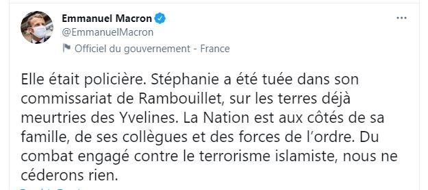 Ο Γάλλος πρόεδρος έγραψε σε ανάρτησή του στο Twitter: Ήταν αστυνομικός. Η Στεφανί σκοτώθηκε στο αστυνομικό τμήμα της στη Ραμπουγιέ, σε μία ήδη πληγείσα περιοχή. Το Έθνος είναι στο πλευρό της οικογένειας και των συναδέλφων της και της αστυνομίας. Στον αγώνα κατά της ισλαμιστικής τρομοκρατίας, δεν θα υποχωρήσουμε ποτέ”.