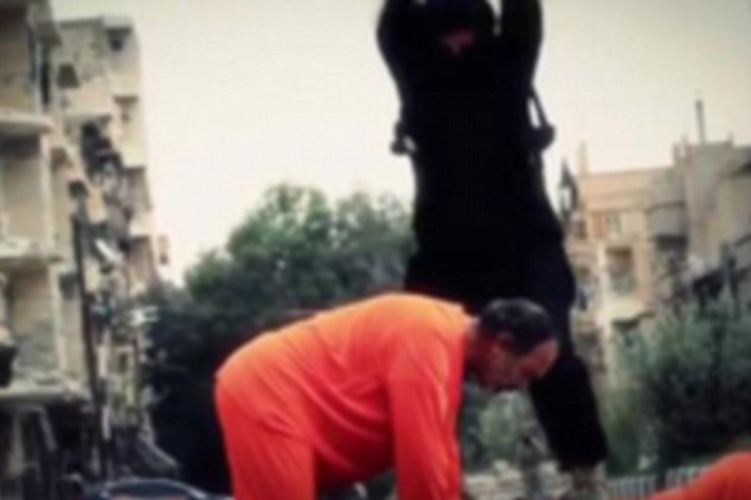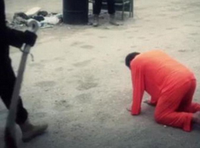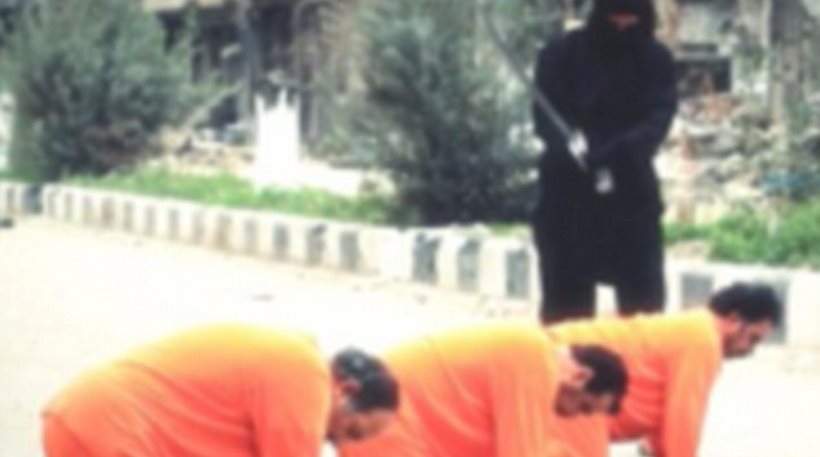 Στις εικόνες που κυκλοφόρησαν οι τρεις άνδρες φορούν τις πορτοκαλί φόρμες, γονατίζουν και δέχονται την επίθεση των τζιχανιστών.
