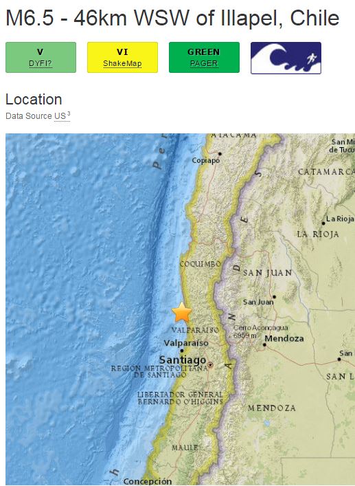 Νέος σεισμός μεγέθους 6,5 Ρίχτερ σημειώθηκε απόψε στη Χιλή και το επίκεντρό της εντοπίστηκε σε απόσταση 143 χιλιομέτρων βόρεια-βορειοδυτικά του Βαλπαραΐσο, ανακοίνωσε η αμερικανική γεωολογική υπηρεσία USGS.