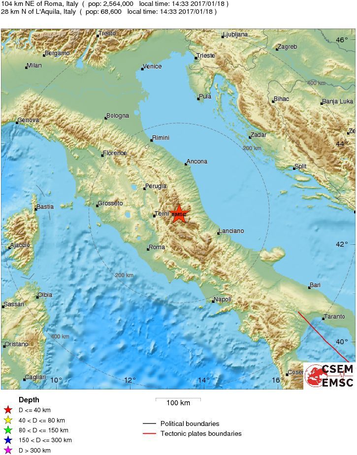 Όσο για το επίκεντρο της δόνησης, εντοπίστηκε στα 104 χιλιόμετρα βορειοανατολικά της Ρώμης.