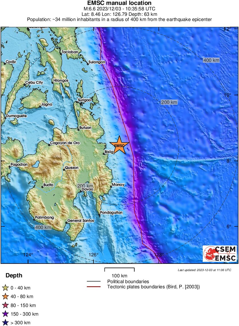 Νέος ισχυρός σεισμός 6,6 βαθμών της κλίμακας Ρίχτερ σημειώθηκε πριν από λίγο στις Φιλιππίνες. Υπενθυμίζεται ότι το Σάββατο έπληξε τo νότιο τμήμα της χώρας ισχυρός σεισμός 7,4 βαθμών, με αποτέλεσμα τουλάχιστον ένας άνθρωπος να χάσει τη ζωή του.