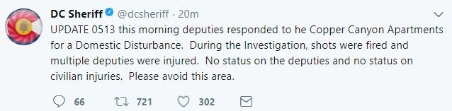 Όπως αναφέρει ο σερίφης της πόλης στον επίσημο λογαριασμό του στο twitter, οι αστυνομικοί δέχτηκαν νωρίς σήμερα το πρωί κλήση για διατάραξη κοινής ησυχίας από κατοίκους του συγκροτήματος κατοικιών Copper Canyon Apartments.