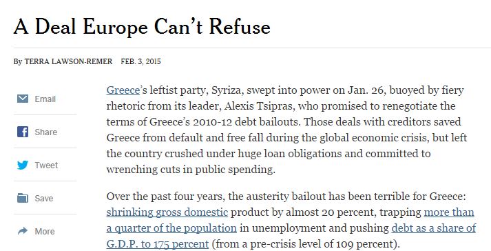 Στο άρθρο, το οποίο υπογράφει η ακαδημαϊκός και συνεργάτιδα του Ινστιτούτου Μπρούκινγκς Terra Lawson-Remer τονίζεται ότι «το ελληνικό αριστερό κόμμα του ΣΥΡΙΖΑ, που έλαβε μια ισχυρή εντολή διακυβέρνησης, ξεχωρίζει για την πύρινη ρητορική του αρχηγού του, Αλέξη Τσίπρα, ο οποίος υποσχέθηκε να επαναδιαπραγματευθεί τους όρους των πακέτων διάσωσης για το ελληνικό χρέος κατά τα έτη 2010 – 2012. Οι συμφωνίες αυτές με τους πιστωτές έσωσαν την Ελλάδα από τη χρεοκοπία και την ελεύθερη πτώση στη διάρκεια της παγκόσμιας οικονομικής κρίσης, αλλά άφησαν τη χώρα να συνθλιβεί κάτω από τεράστιες δανειακές υποχρεώσεις και τη δέσμευσαν προς την κατεύθυνση των περικοπών των δημοσίων δαπανών».
