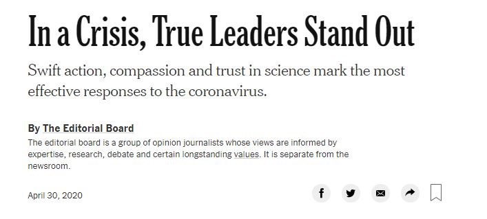 Αναφερόμενο στους ηγέτες των χωρών που κέρδισαν το σεβασμό των λαών τους για την επιτυχή αντιμετώπιση της πανδημίας, το άρθρο των NYT υπογραμμίζει ότι «διαθέτουν συγκεκριμένα και αξιοσημείωτα ηγετικά στοιχεία και προσεγγίσεις, όχι μόνο κατά την τωρινή πανδημία, αλλά και για τις κρίσεις του μέλλοντος. Η θέληση για γρήγορη και τολμηρή ανάληψη δράσης -ακόμη και με τον κίνδυνο πολιτικού ρίσκου- είναι αναμφισβήτητα μεταξύ των σπουδαιότερων χαρακτηριστικών που σφραγίζουν την ηγεσία κατά τη διάρκεια μιας κρίσης. Είναι τώρα προφανές, ότι αποδείχτηκαν καταστροφικές, τόσο οι προσπάθειες της Κίνας να συγκαλύψει το ξέσπασμα της πανδημίας, όσο και του Προέδρου Trump, με το να την υποβαθμίζει επί μακρόν».