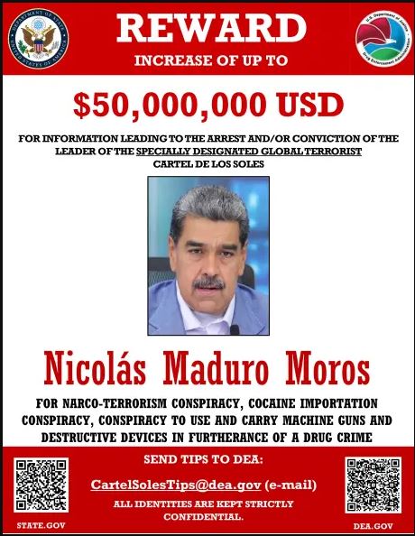 Υπάρχει μια πάγια αμοιβή γι’ αυτόν εδώ και χρόνια, την οποία ο Τραμπ αύξησε στα 50 εκατομμύρια δολάρια το 2025, αφότου κήρυξε το Καρτέλ των Ήλιων τρομοκρατική ομάδα και τον Μαδούρο ηγέτη της.
