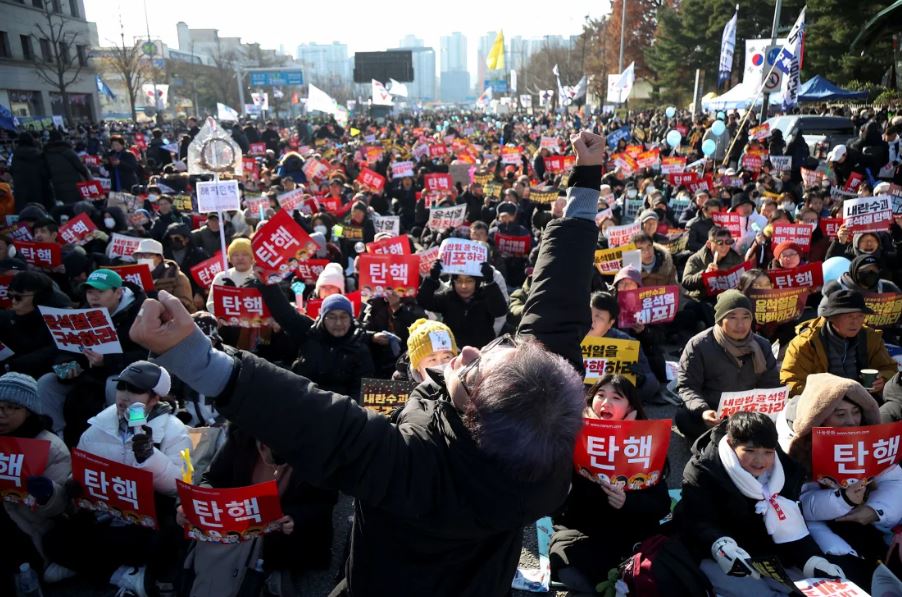Χιλιάδες διαδηλωτές συγκεντρώθηκαν στη Σεούλ το Σάββατο, αψηφώντας το κρύο για να ζητήσουν την παραίτηση του Γιουν πριν από την ψηφοφορία, η οποία εγκρίθηκε από 204 βουλευτές με 85 να ψηφίζουν κατά.