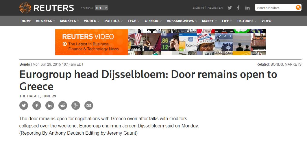 Η πόρτα της διαπραγμάτευσης παραμένει ανοιχτή για την Ελλάδα, υποστήριξε ο πρόεδρος του Eurogroup, Γερούν Ντάισελμπλουμ, σύμφωνα με το πρακτορείο Reuters.