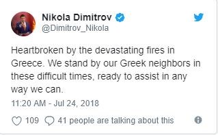 Με μια ανάρτησή του στο twitter, ο υπουργός Εξωτερικών της ΠΓΔΜ, Νικολά Ντιμιτρόφ, αναφέρεται στις πυρκαγιές στην Αττική.