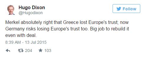 «Η Μέρκελ είχε δίκιο πως η Ελλάδα έχασε την εμπιστοσύνη της Ευρώπης, τώρα η Γερμανία κινδυνεύει να χάσει κι αυτή την εμπιστοσύνη της Ευρώπης, γράφει και επισημαίνει πως θα είναι δύσκολο να αποκατασταθεί ακόμα και αν επιτευχθεί συμφωνία», έγραψε στο twitter, ο Ούγκο Ντίξον.