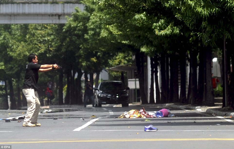 Συγκλονίζουν οι εικόνες από τη στιγμή όπου ένας από τους τρομοκράτες που αιματοκύλισαν τη Τζακάρτα πυροβολεί προς το πλήθος με ένα περίστροφο.