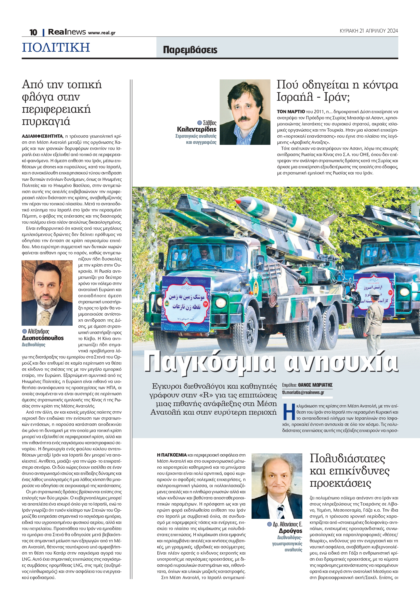 Η κλιμάκωση της κρίσης στη Μέση Ανατολή, με την επίθεση του Ιράν στο Ισραήλ την περασμένη Κυριακή και το ανταποδοτικό πλήγμα των Ισραηλινών στο Ισφαχάν, προκαλεί έντονη ανησυχία σε όλο τον κόσμο. Τις πολυδιάστατες επιπτώσεις αυτής της εξέλιξης επιχειρούν να προσδιορίσουν με άρθρα τους στη Realnews διεθνολόγοι και πολιτικοί αναλυτές, ενώ τις οικονομικές επιπτώσεις μιας ανεξέλεγκτης κρίσης επιχειρούν να εξετάσουν επιφανείς καθηγητές των οικονομικών. Ο Αλέξανδρος Δεσποτόπουλος, ο Θανάσης Δρούγος και ο Σάββας Καλεντερίδης αναλύουν την αβεβαιότητα που έχει προκύψει, τους κινδύνους επέκτασης του πολεμικού κλίματος σε όλη την περιοχή, καθώς και τη λεπτή θέση της Ελλάδας και τις συνέπειες που θα υπάρξουν λόγω της γεωστρατηγικής της θέσης. Ο Παναγιώτης Πετράκης, ο Ιωάννης Χαλικιάς και ο Λευτέρης Θαλασσινός εξετάζουν τους κινδύνους που προκύπτουν για την ελληνική και την παγκόσμια οικονομία από μια πιθανόν ακόμα μεγαλύτερη κλιμάκωση της κρίσης, εστιάζοντας κυρίως στις συνέπειες μιας αύξησης της τιμής του πετρελαίου.