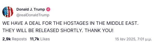 «Έχουμε μια συμφωνία για τους ομήρους στην Μέση Ανατολή. Θα απελευθερωθούν σύντομα», έγραψε ο Ντόναλντ Τραμπ στο TruthSocial για την εκεχειρία στην Γάζα.