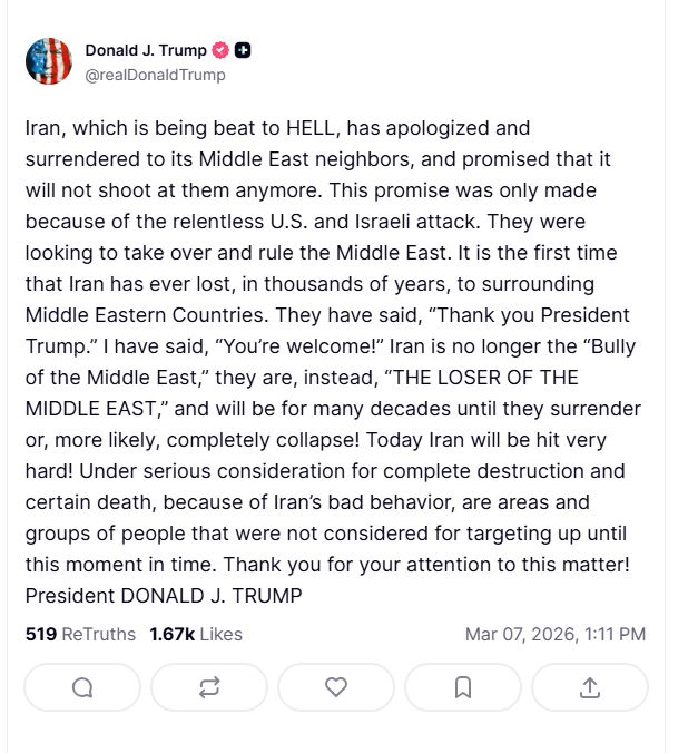 Το Ιράν, που δέχεται σφοδρές επιθέσεις, έχει ζητήσει συγγνώμη και έχει παραδοθεί στους γείτονές του στη Μέση Ανατολή, υποσχόμενο ότι δεν θα τους χτυπήσει ξανά. Αυτή η υπόσχεση έγινε μόνο λόγω της αδιάκοπης επίθεσης των ΗΠΑ και του Ισραήλ. Στόχος τους ήταν να καταλάβουν και να κυβερνήσουν τη Μέση Ανατολή. Είναι η πρώτη φορά στα χιλιάδες χρόνια που το Ιράν χάνει από τις γύρω χώρες της Μέσης Ανατολής. Έχουν δηλώσει: «Ευχαριστούμε, Πρόεδρε Τραμπ». Και εγώ απάντησα: «Παρακαλώ!».