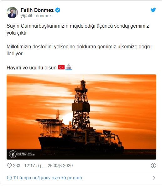 Τα παραπάνω ανακοίνωσε ο Τούρκος υπουργός Ενέργειας Φατίχ Ντονμέζ μέσω Twitter.