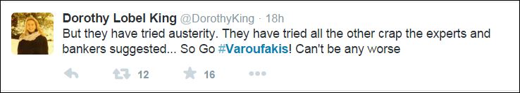 Η γνωστή αρχαιολόγος Ντόροθι Κινγκ εξελίσσεται σε φανατική οπαδό του υπουργού Οικονομικών, Γιάνη Βαρουφάκη, καθώς δεν χάνει ευκαιρία να εκφραστεί ανοιχτά υπέρ της πολιτικής του και να τον εμψυχώνει μέσω του twitter.