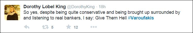 “Και ναι, παρά το γεγονός ότι είμαι αρκετά συντηρητική και αναθρεμμένη, περιτριγυρισμένη από αληθινούς τραπεζίτες, λέω: Δως τους κόλαση Βαρουφάκη!”