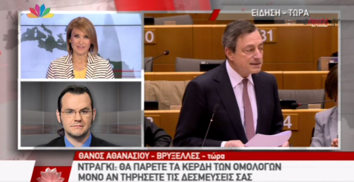 «Τα 1,9 δισ. ευρώ των κερδών επί των ελληνικών ομολόγων, τα οποία επιστρέφονται μέσω των εθνικών τραπεζών, δεν μπορούν να αποδοθούν στην ελληνική πλευρά, παρά μόνο εάν έχουν εκπληρωθεί οι όροι του πέμπτου ελέγχου», ανέφερε νωρίτερα από την ολομέλεια του Ευρωπαϊκού Κοινοβουλίου ο Μάριο Ντράγκι.