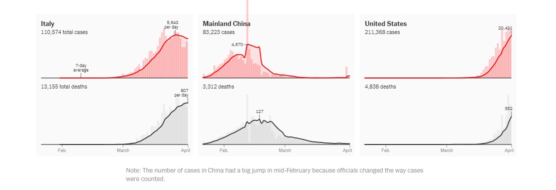 Η τροχιά της πανδημίας του κορονοϊού ποικίλλει σε μεγάλο βαθμό από χώρα σε χώρα. Ο αριθμός των νέων περιπτώσεων κάθε μέρα φαίνεται να πέφτει σε ορισμένα έθνη, αυτό που είναι γνωστό ως εξομάλυνση της καμπύλης. Οι NY TIMES, παρουσιάζουν γραφήματα με την καμπύλη σε διαφορετικές χώρες. Στην Ιταλία για παράδειγμα, ο αριθμός των νέων κρουσμάτων φαίνεται να πέφτει, λόγω και του αυστηρού Lockdown, όμως η θνητότητα συνεχίζει να ανεβαίνει και οι γιατροί υποστηρίζουν ότι η χώρα δεν έχει δει ακόμα το peak της. Η Κίνα, όπου άρχισε η πανδημία φαίνεται να μείωσε δραστικά τόσο τον αριθμό των νέων κρουσμάτων όσο και τους νέους θανάτους. Στις ΗΠΑ, από την άλλη ο αριθμός των νέων επιβεβαιωμένων κρουσμάτων πολλαπλασιάζεται γρήγορα, αλλά μερικά κράτη συνεχίζουν να αντιστέκονται σε πιο αυστηρά μέτρα.