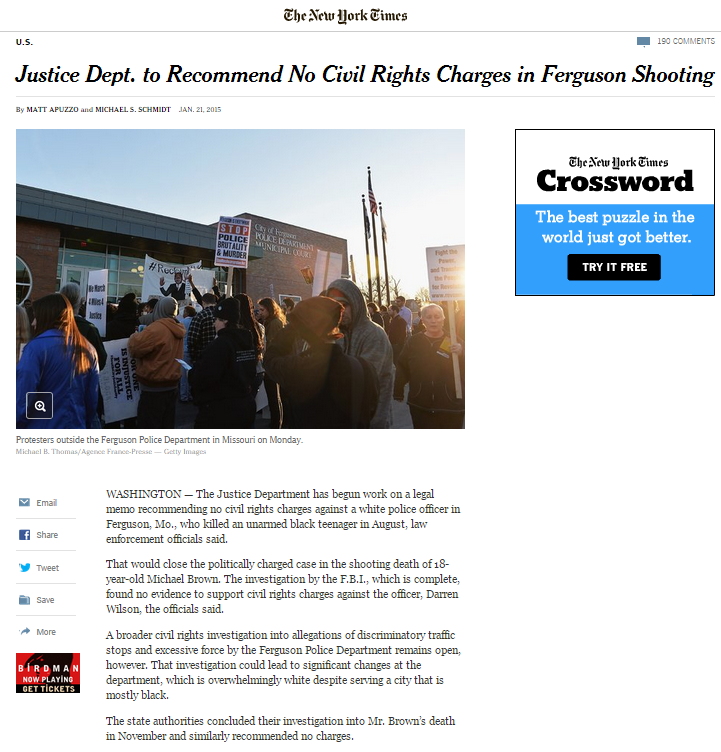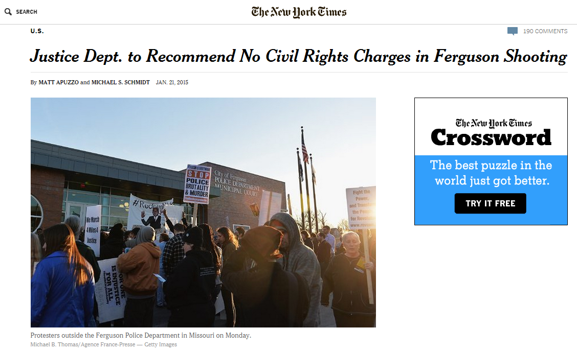 Η εφημερίδα στο άρθρο της επικαλείται σχόλια αστυνομικών που δήλωσαν ότι οι ομοσπονδιακοί εισαγγελείς εργάζονταν πάνω σε ένα νομικό υπόμνημα, στο οποίο γίνεται εισήγηση να μην απαγγελθούν κατηγορίες κατά του αστυνομικού, Ντάρεν Ουίλσον, μετά την ολοκλήρωση έρευνας που διεξήγαγε το FBI. Σύμφωνα με την έρευνα αυτή δεν υπήρχαν επαρκή στοιχεία που να στηρίζουν τις κατηγορίες εναντίον του αστυνομικού.