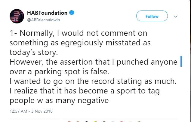 Με αναρτήσεις του στο twitter ο ηθοποιός Άλεκ Μπόλντουιν μιλά για τη σύλληψή του την Παρασκευή, στο Μανχάταν, καθώς φέρεται να γρονθοκόπησε και να έστειλε στο νοσοκομείο με σπασμένο σαγόνι έναν άνδρα με τον οποίο διαπληκτίστηκαν για μία θέση πάρκινγκ.