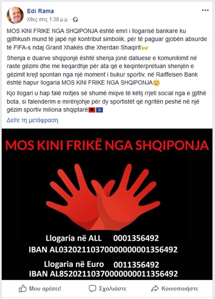 Και, όμως, δεν είναι τρολ…Ο Αλβανός Πρωθυπουργός, Έντι Ράμα ανακοίνωσε μέσω ανάρτησής στο λογαριασμό του στο Facebook ότι ανοίγει λογαριασμό σε ελβετική τράπεζα ούτως ώστε οι συμπατριώτες να συμβάλλουν με τον οβολό τους, προκειμένου να πληρωθεί το πρόστιμο των 17.000 ευρώ που επιβλήθηκε στους Τσάκα και Σακίρι για τον πολυσυζητημένο πανηγυρισμό τους στο ματς με τη Σερβία.Συγκεκριμένα, οι δύο αλβανικής καταγωγής ποδοσφαιριστές πανηγύρισαν σχηματίζοντας τον αλβανικό αετό και η FIFA τους τιμώρησε με πρόστιμο. Έτσι ο Ράμα καλεί τους πολίτες να συνδράμουν, ώστε οι παίκτες της Εθνικής Ελβετίας να μην επιβαρυνθούν απο την ποινή της FIFA.