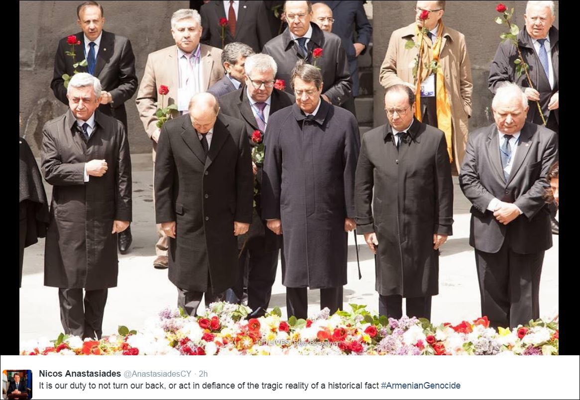 Στις εκδηλώσεις μνήμης για τα 100 χρόνια από τη γενοκτονία των Αρμενίων, που πραγματοποιήθηκαν στο Ερεβάν της Αρμενίας, έδωσε το «παρών» ο Πρόεδρος της Κυπριακής Δημοκρατίας, Νίκος Αναστασιάδης.
