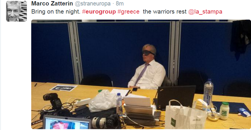 Ο Marco Zatterin, ανταποκριτής της La Stampa στην καρδιά της Ευρώπης και των κρίσιμων εξελίξεων, ανέβασε στο λογαριασμό του στο twitter μια φωτογραφία με μάσκα… ύπνου, κάνοντας ένα αστείο για να τον φωτογραφίσουν οι συνάδελφοί του για τη δύσκολη νύχτα που έχουν μπροστά τους.