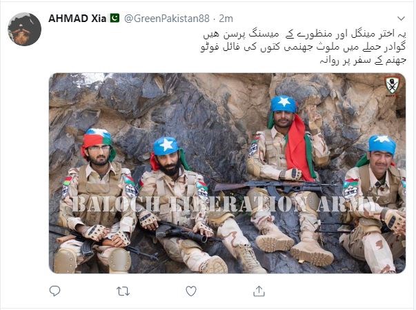 Λίγο αργότερα, η οργάνωση Απελευθερωτικός Στρατός του Μπαλουχιστάν, ένοπλη οργάνωση που μάχεται για μεγαλύτερη αυτονομία στην περιοχή Μπαλουχιστάν του νοτιοδυτικού Πακιστάν, ανέλαβε την ευθύνη για την επίθεση, ανέφερε σε ανακοίνωσή του ένας εκπρόσωπός της.
