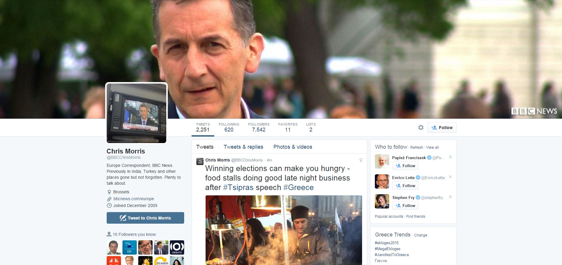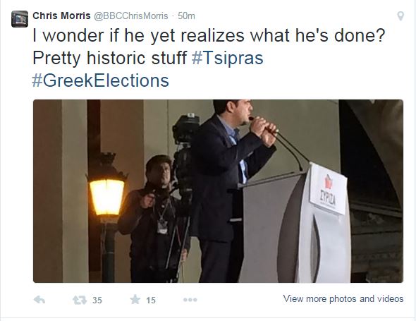 «Αναρωτιέμαι αν έχει συνειδητοποιήσει τι έκανε. Αρκετά ιστορικό πράγμα», ανέφερε στον προσωπικό του λογαριασμό στο Twitter, ο απεσταλμένος του BBC στην Αθήνα, Κρις Μόρρις.