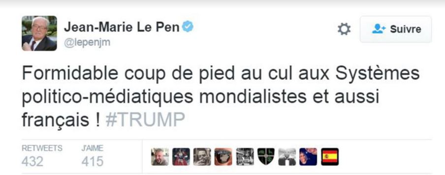Μετά τη Μαρίν Λεπέν τη σκυτάλη των πανηγυρισμών για την νίκη του Ντόναλντ Τραμπ στις αμερικανικές εκλογές πήρε ο πατέρας της, Ζαν Μαρί Λεπέν ο οποίος έγραψε στο twitter: