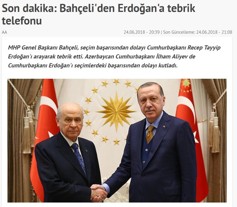 Όπως μεταδίδει η Hurriyet ο ηγέτης του ακροδεξιού MHP και σύμμαχος του Ερντογάν, Ντεβλέτ Μπαχτσελί, του τηλεφώνησε για να τον συγχαρεί για τη διαφαινόμενη νίκη του.