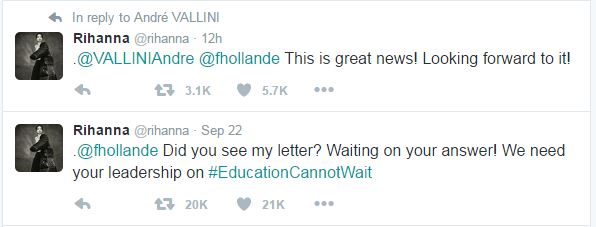 “@Ολάντ, λάβατε την επιστολή μου; Περιμένω απάντησή σας! Χρειαζόμαστε την ηγεσία σας όσον αφορά το πρόγραμμα ‘Education Cannot wait'”, είχε γράψει την Πέμπτη στο Twitter η 28χρονη τραγουδίστρια από τα Μπαρμπέιντος, η οποία έχει 65,9 ακόλουθους σε αυτό το μέσο κοινωνικής δικτύωσης.