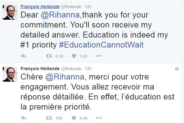 O Πρόεδρος της Γαλλίας απάντησε με μήνυμα στο Twitter στην σταρ της ποπ Ριάνα, η οποία είχε απευθυνθεί στον Φρανσουά Ολάντ για να μάθει για την πορεία ενός προγράμματος της Unicef που είναι αφιερωμένο στην εκπαίδευση.