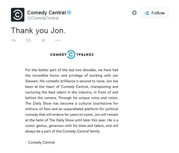 «Για περισσότερες από δύο δεκαετίες, είχαμε το απίστευτο προνόμιο να συνεργαζόμαστε με τον Τζον Στιούαρτ» αναφέρει η ανακοίνωση του δικτύου. «Μέσα από τη μοναδική φωνή και το όραμά του στο The Daily Show έχει καταστεί μοναδικός για τα εκατομμύρια των οπαδών του και δημιούργησε μια απαράμιλλη πλατφόρμα για πολιτική κωμωδία που θα ζήσει για τα επόμενα χρόνια».