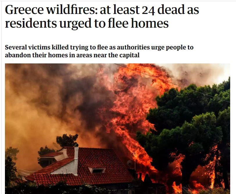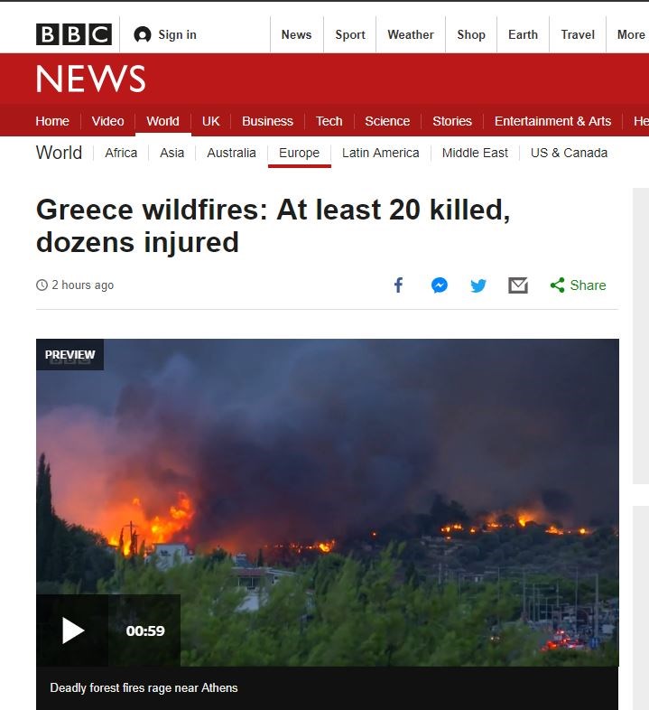 Στον ιστότοπο του BBC, οι πυρκαγιές στην Ανατολική Αττική ήταν το πρώτο θέμα, υπό τον τίτλο «Τουλάχιστον 20 νεκροί στις πυρκαγιές στην Ελλάδα».