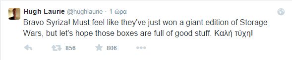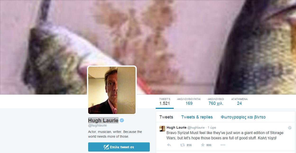 Ο Βρετανός ηθοποιός Χιού Λώρι, ευρύτερα γνωστός στον ρόλο του “Dr. House”, στην ομώνυμη αμερικανική τηλεοπτική σειρά, έγραψε στον προσωπικό του λογαριασμό στο Twitter, «Μπράβο ΣΥΡΙΖΑ».