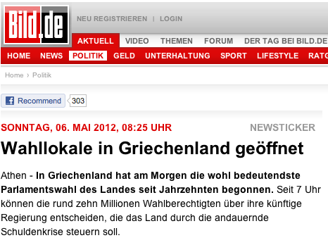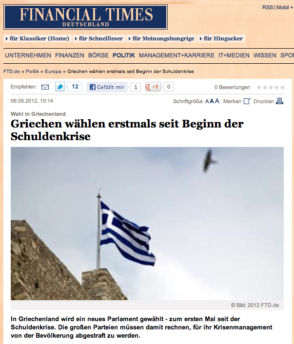 Οι εκλογές στην Ελλάδα είναι το πρώτο θέμα σήμερα στον γερμανικό τύπο. Ως “ευκαιρία του λαού να μιλήσει” περιγράφει η Γερμανία τις εκλογές της Ελλάδας…Financial Times Deutschland: “Οι Έλληνες ψηφίζουν για πρώτη φορά από την έναρξη της κρίσης”