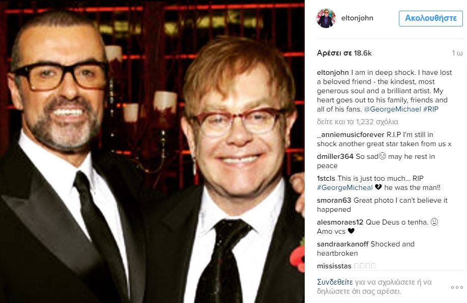 «Είμαι βαθύτατα σοκαρισμένος» έγραψε ο τραγουδιστής Έλτον Τζον στο Instagram σχετικά με την είδηση του θανάτου του φίλου του Τζορτζ Μάικλ.