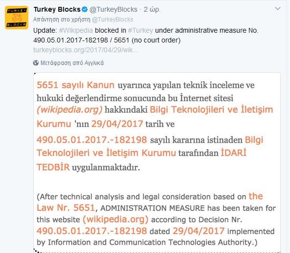 Οι τουρκικές Αρχές προχώρησαν σε άλλη μια καταστολή της ελευθερίας του λόγου στο διαδίκτυο μπλοκάροντας σήμερα την πρόσβαση στην ιστοσελίδα Wikipedia, όπως ανακοίνωσε ένας οργανισμός επιτήρησης του διαδικτύου.Το μπλοκάρισμα της ιστοσελίδας σε όλες τις γλώσσες εντοπίστηκε σήμερα στις 8:00 το πρωί, ανέφερε στον ιστότοπό του ο οργανισμός επιτήρησης Turkey Blocks.