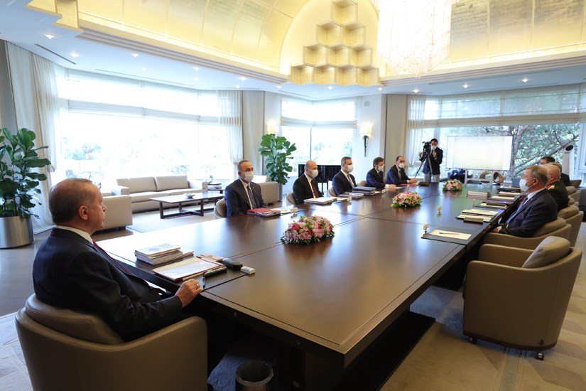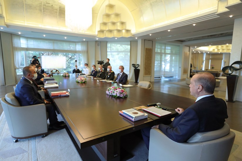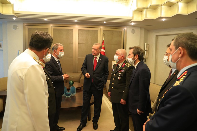 Κι ενώ όλοι οι παριστάμενοι ακολουθούν τα μέτρα προστασίας τηρώντας αποστάσεις και φορώντας μάσκες, ο πρόεδρος Ερντογάν δεν συμμορφώνεται προεδρεύοντας της σύσκεψης χωρίς μάσκα, ενώ ακολούθως και στα πηγαδάκια που σχηματίστηκαν παρακολουθεί χωρίς να φορά μάσκα. Παρόντες ήταν ο αντιπρόεδρος Φουάτ Οκτάι, ο υπουργός Εξωτερικών Μεβλούτ Τσαβούσογλου, ο υπουργός Εθνικής Άμυνας Χουλουσί Ακάρ, ο υπουργός Εσωτερικών Σουλεϊμάν Σοϊλού, ο αρχηγός του Γενικού Επιτελείου Γιασάρ Γκιουλέρ, ο αρχηγός του Στρατού Ουμίτ Ντουντάρ , ο ναύαρχος Αντνάν Οζμπάλ , ο αρχηγός της Αεροπορίας Χασάν Κακακγιούζ. Οι φωτογραφίες δόθηκαν στη δημοσιότητα από την τουρκική προεδρία.