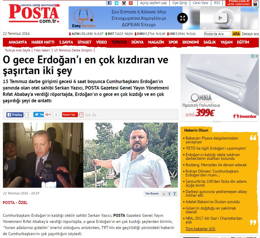Όπως αναφέρει το δημοσίευμα, ο Ταγίπ Ερντογάν, την ώρα που έγινε γνωστή η είδηση για το πραξικόπημα βρισκόταν στο ξενοδοχείο στη Μαρμαρίδα και οι συνεργάτες του τον πίεζαν έντονα να μεταβεί σε κάποιο ελληνικό νησί.