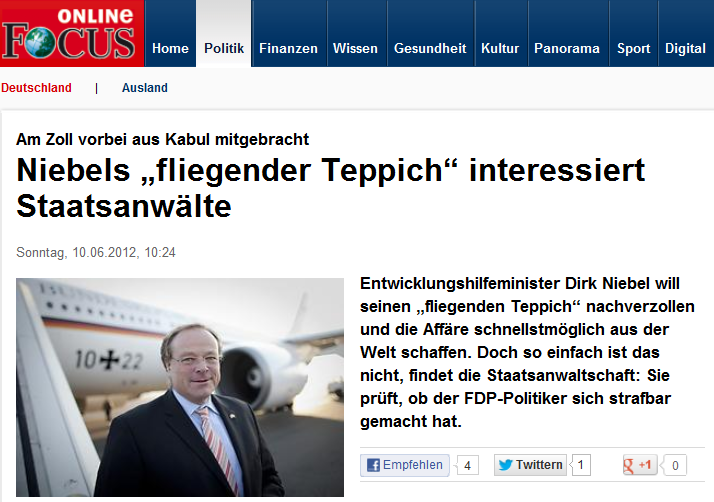 Κατά την διάρκεια επίσημης επίσκεψής του στο Αφγανιστάν, ο Γερμανός αξιωματούχος αγόρασε ένα χειροποίητο χαλί αξίας 1100 ευρώ, το οποίο ωστόσο, επειδή δεν χωρούσε στις αποσκευές του, μεταφέρθηκε στην Γερμανία με πτήση των γερμανικών μυστικών υπηρεσιών. Στο αεροδρόμιο το χαλί παρελήφθη από τον οδηγό του υπουργού, ο οποίος, καθώς δεν είχε ανάλογη εντολή, παρέλειψε να το δηλώσει στις τελωνειακές αρχές.