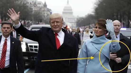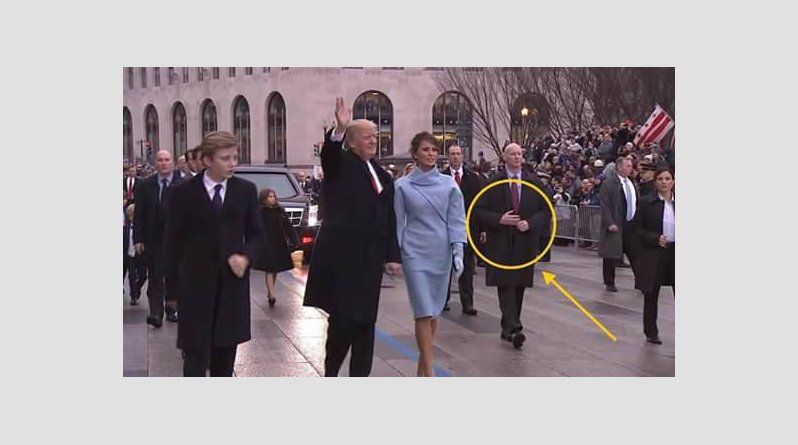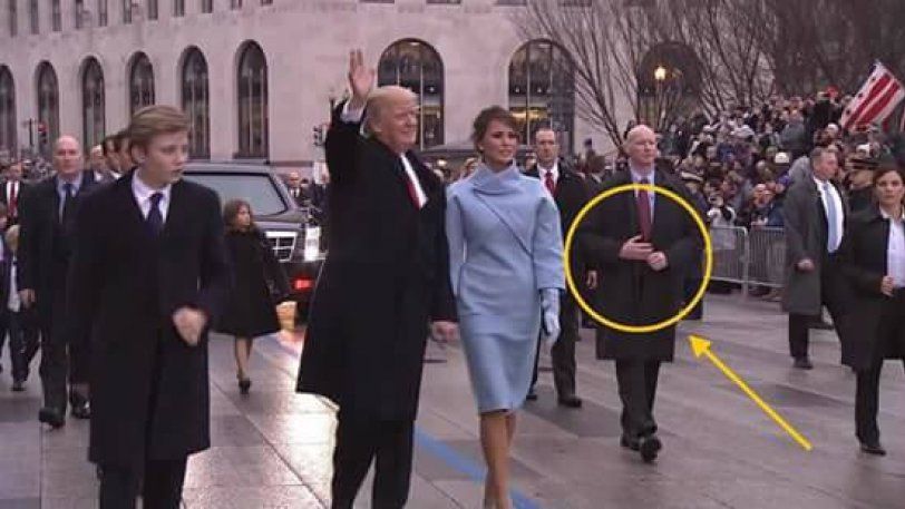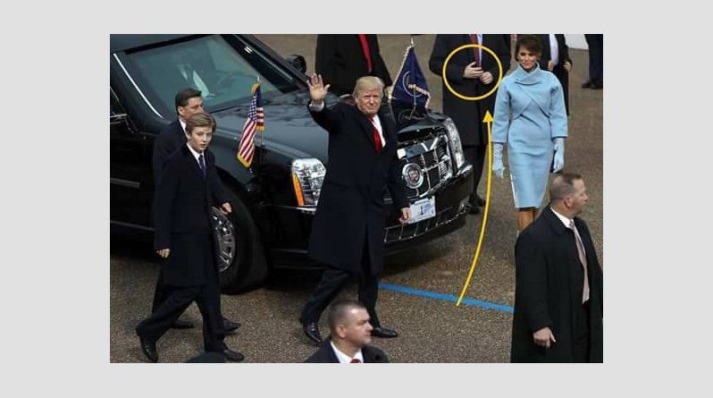 Την ώρα που τα βλέμματα ήταν στραμμένα στον Ντόναλντ Τραμπ, ένας από τους φρουρούς που ακολουθούσε την πρώτη κυρία, Μελάνια Τραμπ, είχε σε γωνία τα χέρια του, σαν να φτιάχνει το παλτό του. Ωστόσο τα χέρια του ήταν σε αυτή τη θέση σε όλη τη διάρκεια της εκδήλωσης.