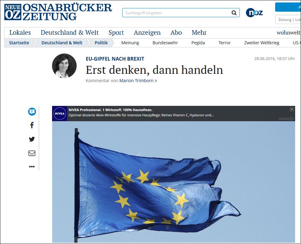 Η Neue Osnabrücker Zeitung ασχολείται με τις αντιδράσεις ηγετικών στελεχών της Ε.Ε. μετά τη βρετανική απόφαση εξόδου από την Ε.Ε. και ρωτά: «Δεν έμαθαν οι Ευρωπαίοι πολιτικοί τίποτα από το βρετανικό δημοψήφισμα; Στη σύνοδο κορυφής δεν έγινε λόγος για κάποια μεγάλη μεταρρύθμιση η οποία θα αλλάξει πραγματικά την Ε.Ε, η οποία θα μπορούσε να την φέρει πιο κοντά στους πολίτες και θα την κάνει λιγότερο γραφειοκρατική. Οι Βρετανοί όμως κατέστησαν σαφές ότι δεν θέλουν να έχουν καμία σχέση με την Ε.Ε. στη σημερινή της μορφή. Αντίθετα οι αρχηγοί των κρατών μελών έδωσαν έμφαση στην ολοκλήρωσή της. Δεν θα πάνε καλά έτσι τα πράγματα. Με αυτόν τον τρόπο οι Ευρωπαίοι βάζουν τις βάσεις για νέες ήττες, όπως π.χ με δημοψηφίσματα σε άλλες χώρες».