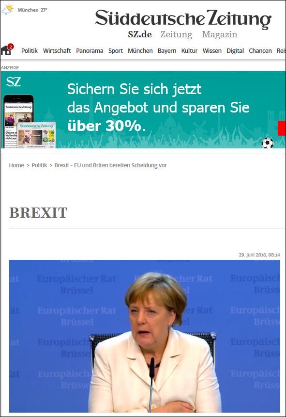 Η συντηρητική Frankfurter Allgmeine Zeitung γράφει: «Στην παρούσα κατάσταση δεν είναι το πλέον λανθασμένο πράγμα να θέλει η καγκελάριος Μέρκελ να κερδίσει λίγο χρόνο για να βγάλει τα σωστά συμπεράσματα για το βρετανικό δημοψήφισμα. Ένα από αυτά τα συμπεράσματα είναι προφανές, ότι δηλαδή και η καγκελάριος Μέρκελ δεν θα πρέπει να το σκέφτεται για πολύ: Η Ε.Ε. πρέπει να τηρήσει τους κανόνες, τις συνθήκες και τις υποσχέσεις της. Η Μέρκελ παραδέχθηκε ότι όλα αυτό δεν γινόταν πάντοτε. Στην παραβίασή τους και την αθέτησή τους συμμετείχε και το Βερολίνο. Τις περισσότερες φορές ο στόχος ήταν να διατηρηθούν όσα επετεύχθησαν και να εμποδιστούν τα χειρότερα. Μακροπρόθεσμα όμως τέτοια τεχνάσματα θέτουν σε κίνδυνο ακριβώς αυτό το οποίο θέλουν να διασώσουν. Αν η ευρωπαϊκή πολιτική ηγεσία το αντιληφθεί επιτέλους, τότε η αποχώρηση των Βρετανών θα έχει προσφέρει μιαν υπηρεσία στην Ευρώπη».