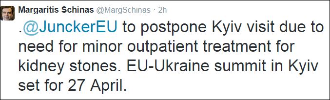 Όπως έγραψε στο twitter ο εκπρόσωπος της Κομισιόν, Μαργαρίτης Σχοινάς, ο Γιούνκερ έχει πέτρα στα νεφρά και θα υποβληθεί σε θεραπεία.