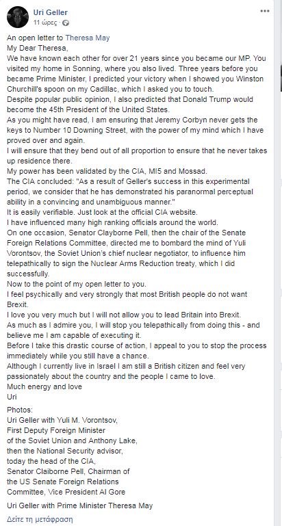 Τον θυμόμαστε όλοι να «λυγίζει» με τηλεπάθεια τα κουτάλια στις εμφανίσεις του στην τηλεόραση. Ο Γιούρι Γκέλερ, ο Ισραηλινός μάγος, έστειλε ανοιχτή επιστολή στην πρωθυπουργό της Μεγάλης Βρετανίας Τερέζα Μέι και ούτε λίγο ούτε πολύ, ισχυρίζεται ότι δεν θα την αφήσει να οδηγήσει τον λαό εκτός Ευρωπαϊκής Ένωσης. Πώς θα τοπ κάνει αυτό; Με τηλεπάθεια.Στην επιστολή του λέει ότι ένιωσε πολύ δυνατά όλη αυτή την ενέργεια των Βρετανών που αντιδρούν στο Brexit και δεν θα την αφήσει να κάνει κάτι τέτοιο στην χώρα όπου αγαπήθηκε και έγινε διάσημος για τα μαγικά του.Δείτε την επιστολή: