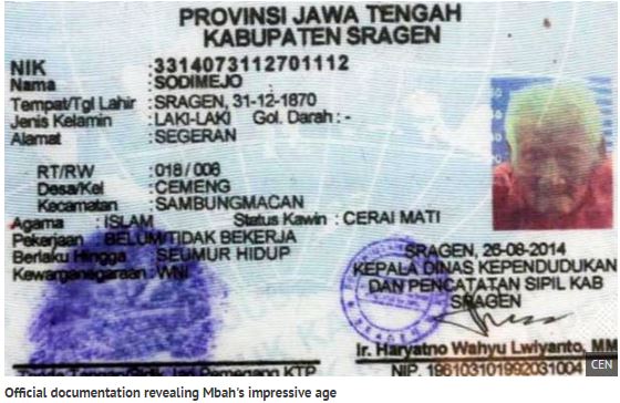 Τον τίτλο του γηραιότερου ανθρώπου στον κόσμο διεκδικεί ένας άνδρας από την Ινδονησία. Πρόκειται για τον Mbah Gotho, ο οποίος σύμφωνα με το πιστοποιητικό γέννησης, είναι 145 ετών, καθώς ήρθε στη ζωή στις 31 Δεκεμβρίου του 1870.